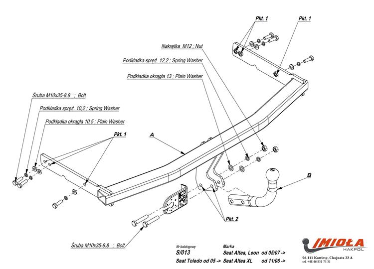 Если вы добрались до этой страницы, значит, вы хотите купить фаркоп для SEAT TOLEDO. с 2004 по 2009 г.в. Это тягово-сцепное устройство с шаром типа - A, предназначенное для модели SEAT TOLEDO. Изготовителем фаркопа является компания Imiola, производство Польша. Более подробная информация о производителе фаркопов доступна на вкладке производителей. Система крепления крюка фаркопа S-013 представляет собой условно съемный шар (на двух болтах). В комплекте,если смарт не нужен. Согласно техническим данным Imiola, максимальный вес буксируемого прицепа не должен быть выше 1600 кг, а вертикальная нагрузка на шар крюка – 75 кг. Для установки фаркопа требуется демонтаж бампера. Требуется подрезка бампера. Полные инструкции по установке фаркопа включены в комплект. Если есть Европейское одобрение изделия, то оно находится на паспортной табличке. Фаркоп S-013 отлично подходит для буксировки прицепов и для перевозки велосипедов на платформе, который может быть установлен непосредственно на фаркоп. Соответствующие велокрепления и платформы можно найти в разделах нашего сайта. Безусловно, наш фаркоп будет полезен в повседневном использовании в течение многих лет.